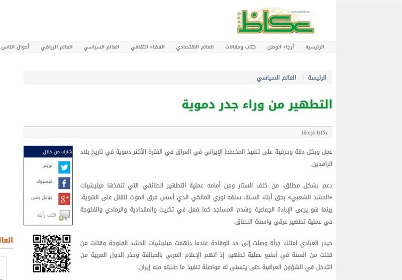 به گزارش تسنیم، عکاظ در ادامه گزارش‌های تخریبی و تحریک‌آمیز خود درباره حشد شعبی عراق ادعا می‌کند که «حشد شعبی بزرگترین ارتش ایران است، شبه‌نظامیان حشد یا ارتش ایران در عراق به عملیات تغییر بافت جمعیتی در مناطق سنی‌نشین دست می‌زنند...طرح حشد طایفه‌ای در راندن اهل سنت از مناطق‌شان و جایگزین کردن شیعیان به جای آنها بیانگر تغییر بافت جمعیتی عمدی دستوری از سوی ایران حامی نخست این حشد است».