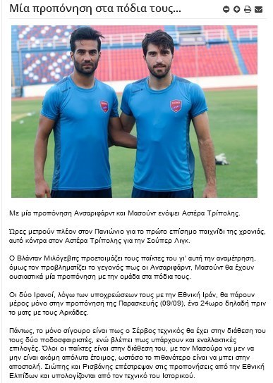 در ادامه گزارش این سایت یونانی آمده است: ولادان میلویوویچ، سرمربی صربستانی تیم پانیونیوس در حال انتخاب 11 بازیکن اصلی بازی برابر آستراس است، اما یک واقعیت نگران کننده برای او تنها یک جلسه تمرینی انصاری فرد و شجاعی قبل از این بازی خواهد بود. البته مسئله مهم این است که ولادان دو بازیکن ایرانی را خود را در اختیار خواهد داشت و با توجه به آمادگی مطلوب تمام بازیکنان میتواند ترکیب ایده آل خود را برابر آستراس روانه میدان کند.