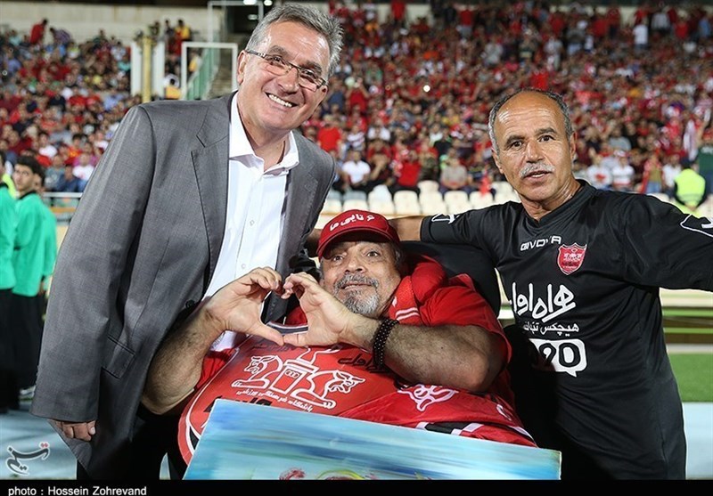 سرمربی پرسپولیس به محض حضور در زمین بازی، به سمت سکوی پرسپولیسی‌ها رفت و دور افتخار زد.