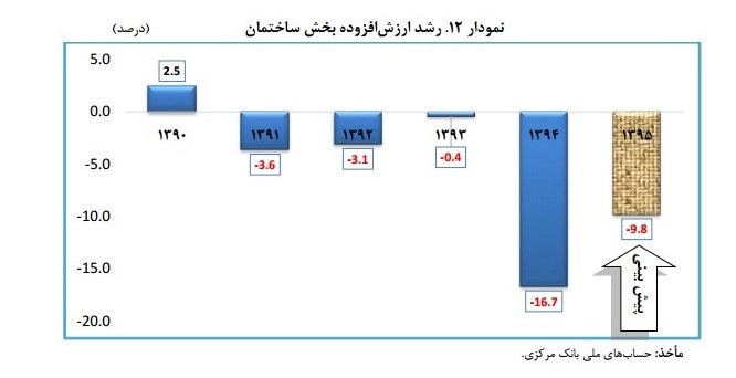 در این گزارش آمده است: آمار رشد ارزش افزوده بخش ساختمان طی سالهای 1390 تا 1394 حاکی از رکود بخش ساختمان در این دوره زمانی است. با توجه به نقش مؤثری که پرداختهای عمرانی دولت در ارزش افزوده بخش ساختمان دارد و همچنین با توجه به عملکرد 27.7 هزار میلیارد تومانی هزینههای عمرانی دولت در سال 1394 و برآورد مرکز پژوهشها از تحقق 25 هزار میلیارد تومانی هزینههای عمرانی تا پایان سال 1395 (تحقق 44 درصدی قانون) و با عنایت به سایر موارد مد نظر ازجمله سرمایه گذاری بخش خصوصی در ساختمان تا انتهای سال جاری، برآورد مرکز پژوهشها، از رشد ارزش افزوده بخش ساختمان در انتهای سال 1395 برابر با 9.8 -درصد میباشد.