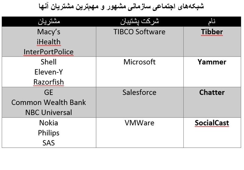 لیستی از مشهورترین شبکههای اجتماعی سازمانی و مهمترین مشتریان به شرح زیر است: