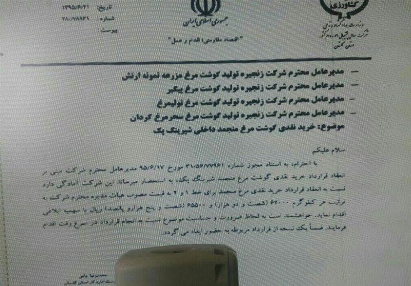 نامه ذیل گزارش مجوز خرید تضمینی مرغ مرغداران توسط شرکت پشتبانی امور دام استان گلستان است که با استناد به مجوز مدیر عامل شرکت صادر شده است .