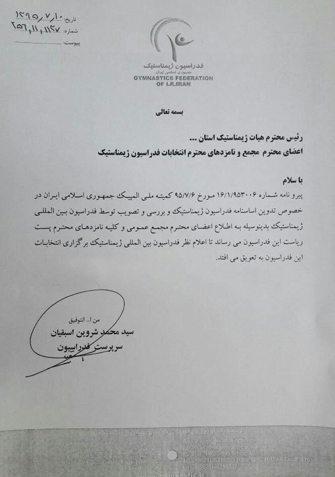 به گزارش خبرنگار ورزشی خبرگزاری تسنیم، در حالی که انتخابات فدراسیون ژیمناستیک قرار بود روز دوشنبه 12 مهر ماه برگزار شود، اما شروین اسبقیان سرپرست فدراسیون اعلام کرد که این انتخابات تا زمان تدوین اساسنامه و تصویب آن، لغو شده است.