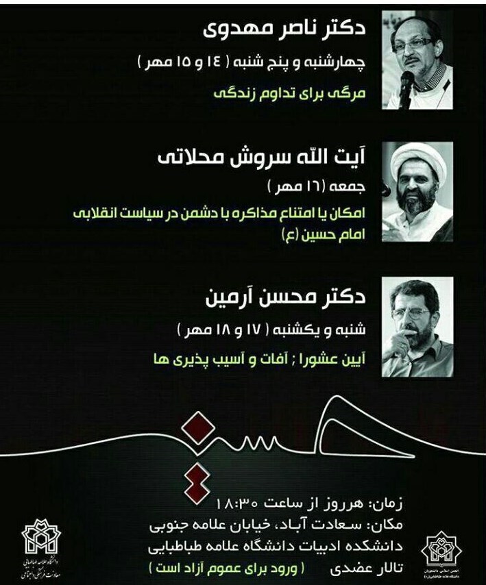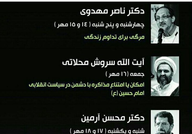 همچنین قرار است، سروش محلاتی از حامیان جریان اصلاحات در روز جمعه، 16 مهر نیز در این مراسم با موضوع امکان یا امتناع مذاکره با دشمن در سیاست انقلابی امام حسین(ع) سخنرانی کند.