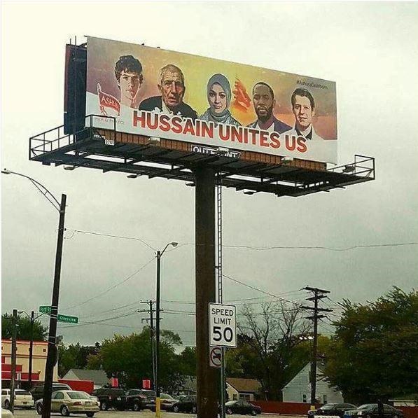 امسال در اقدامی فرهنگی شیعیان در امریکا اقدام به طراحی بیلبوردهایی با محتوای «HUSSAIN UNITES US» کرده اند. این بیلبوردها که سطح ایالات کشور امریکا به نمایش درآمده است. تصاویر مسلمانان با نژادهای مختلف را نشان می دهد که از عشق به امام حسین (ع) گرد هم میآیند و حرکات سیاسی و مذهبی مهم انجام میدهند.