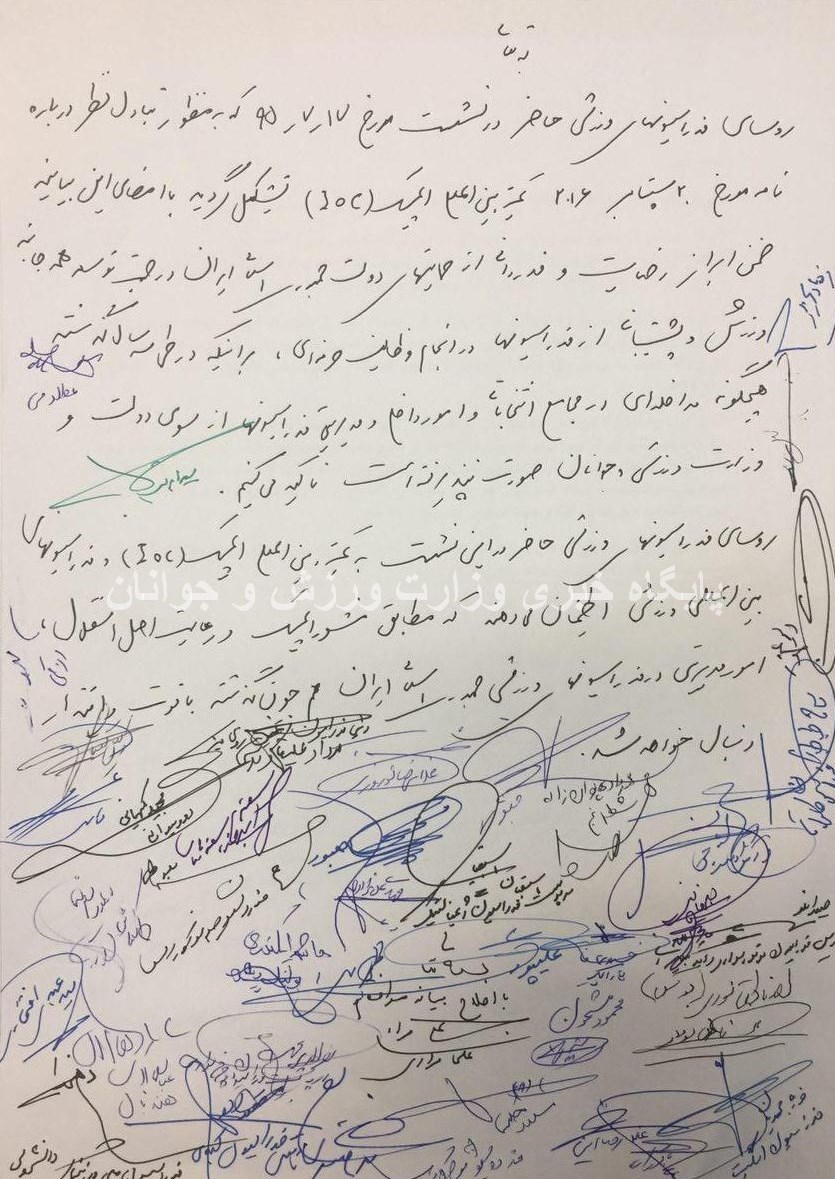 رؤسای فدراسیونهای ورزشی حاضر در نشست مورخ 95/7/17 که بهمنظور تبادل نظر درباره نامه مورخ 20 سپتامبر 2016 کمیته بینالمللی المپیک تشکیل گردید، با امضای این بیانیه ضمن ابراز رضایت و قدردانی از حمایتهای دولت جمهوری اسلامی ایران در جهت توسعه همهجانبه ورزش و پشتیبانی از فدراسیونها در انجام وظایف حرفهای بر اینکه طی سه سال گذشته هیچگونه مداخلهای در مجامع انتخاباتی و امور داخلی و مدیریتی فدراسیونها از سوی دولت و وزارت ورزش و جوانان صورت نپذیرفته است تأکید میکنیم. رؤسای فدراسیونهای ورزشی حاضر در این نشست به کمیته بینالمللی المپیک و فدراسیونهای بینالمللی ورزشی اطمینان میدهند که مطابق منشور المپیک و رعایت اصل استقلال، امور مدیریتی در فدراسیونهای ورزشی جمهوری اسلامی همچون گذشته با قوت و اقتدار دنبال خواهد شد».