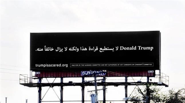 در این بیلبورد که در بزرگراهی در میشیگان نصب شده، اظهارات ترامپ علیه مسلمانان و مهاجران به سخره گرفتهشده و روی صفحهای سیاه رنگ با رنگ سفید و به زبان عربی، نوشته شدهاست: «دونالد ترامپ نمیتواند این را بخواند، اما به هر حال از این (بیلبورد) خواهد ترسید.»