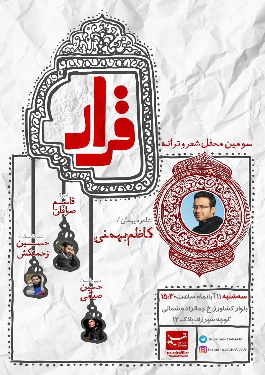 بههمت باشگاه خبرنگاران تسنیم «پویا» سومین جلسه از محفل شعر و ترانه «قرار» سهشنبه 11 آبانماه از ساعت 15:30 الی 17:30 در ساختمان باشگاه خبرنگاران تسنیم واقع در بلوار کشاورز خیابان جمالزاده شمالی،کوچه شیرزاد، پلاک 12 برگزار میشود.
