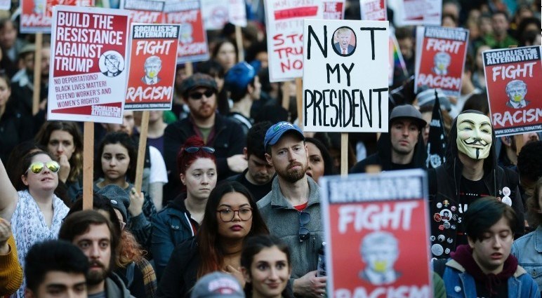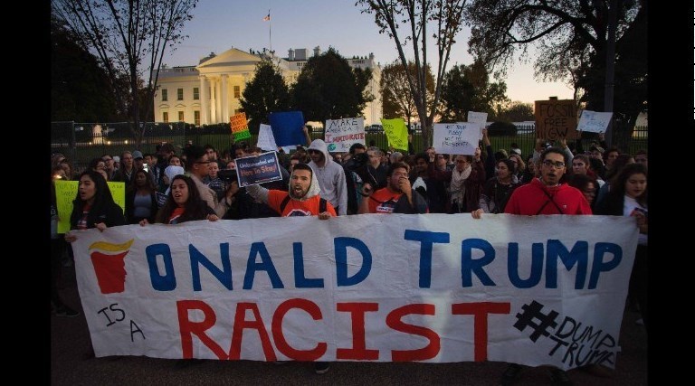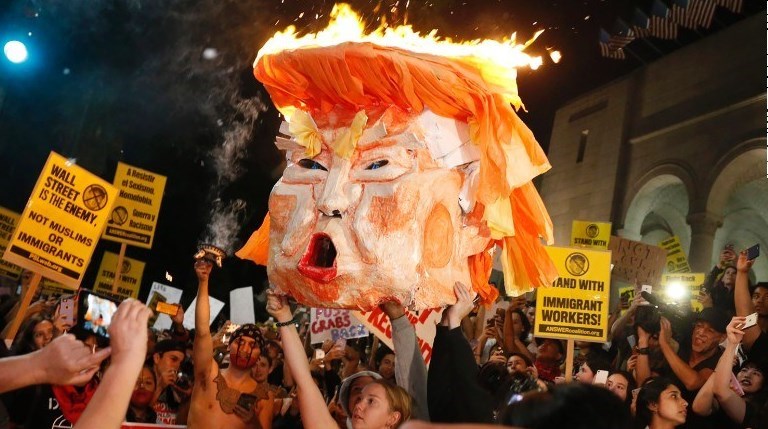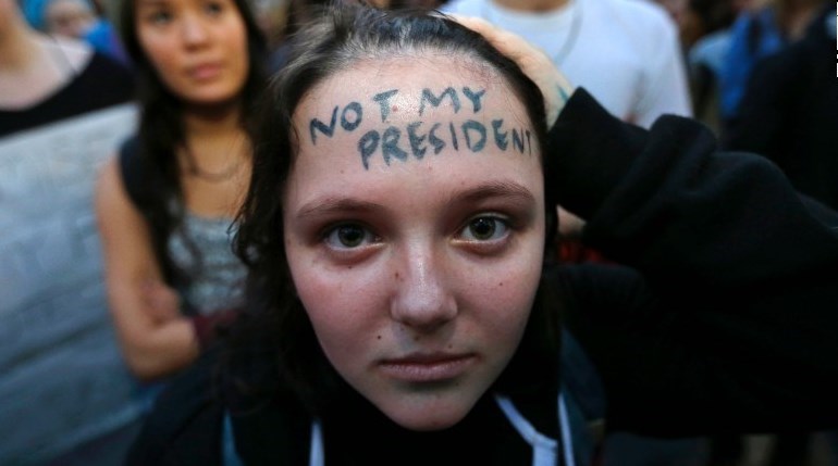 به محض مشخص شدن چهره پیروز راهیافته به کاخ سفید، هزاران نفر در کالیفرنیا به خیابان ها آمدند و مقابل ساختمان فدرالی در لس آنجلس جمع شدند و با اشاره به ترامپ شعار سر دادند « او رئیس جمهور من نیست. »