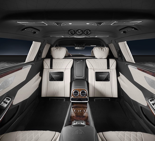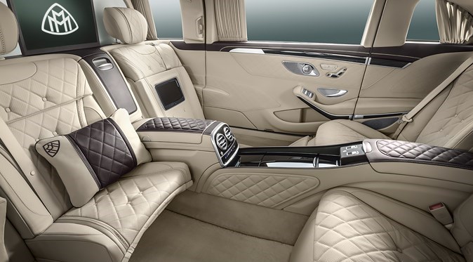فاصله بیشتر بین دو محور این خودرو باعث افزایش فضای داخلی شده است. کابین درجه یک این خودرو دارای دو صندلی مستقل است که قابلیت خمیدگی 43.5 درجهای دارند. این صندلیها دارای ماساژور، تهویه هوا، گرمکن و روکش چرم هستند. حتی دستههای صندلی این خودرو نیز قابلیت گرمشدن دارند. داخل S600 آپشنهای رفاهی و سرگرمی متعددی تعبیه شده است. روکش چوبی دستساز با ساعت آنالوگ طراحی IWC به انحصار این خودرو افزوده است. یک سیستم صوتی سه بعدی 1540 وات و 24 بلندگو، پخش موسیقی با کیفیت در داخل این خودرو را تضمین میکند.