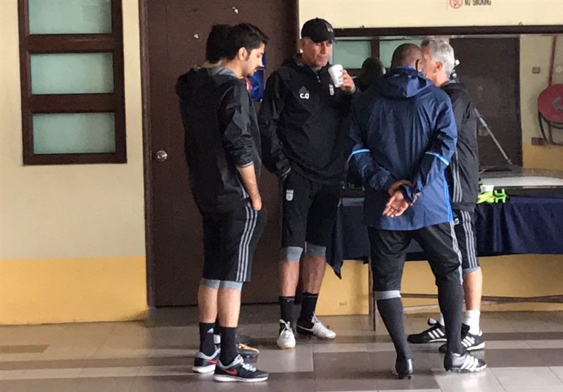 کارلوس کیروش با شروع دوباره باران همراه با دستیارانش به کنار زمین آمد و در حال نوشیدن قهوه و تماشای وضعیت زمین تمرین بود تا درباره نحوه و زمان شروع تمرینات تصمیم بگیرد.