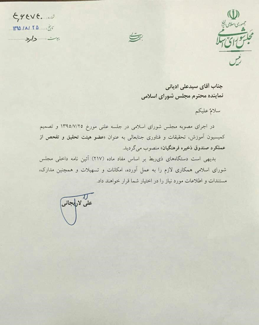 تصویر حکم انتصاب عضویت ادیانیراد بر هیئت تحقیق و تفحص از صندوق ذخیره فرهنگیان توسط علی لاریجانی