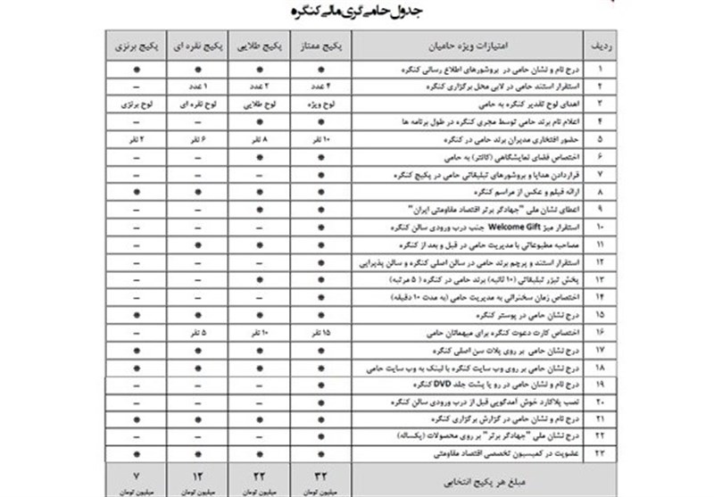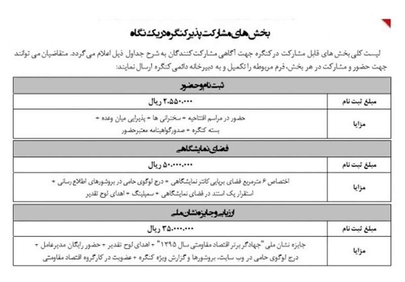 در یکی از فایل های معرفی این همایش، بخش های قابل مشارکت با مبلغی که باید برای هر بخش آن پرداخت شود بیان شده است.