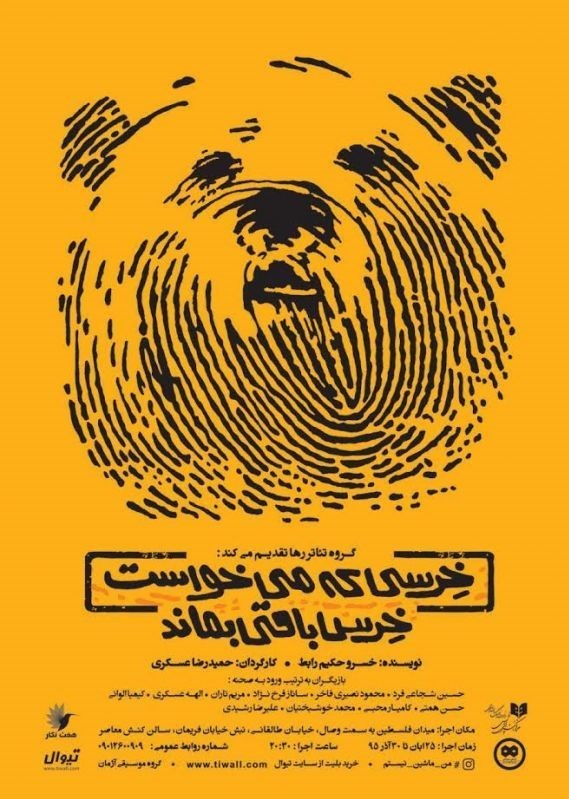 رضا مولایى پنجشنبه نمایش «خرسی که می خواست خرس باقی بماند» را افتتاح کرد. نمایش خسرو حکیم توسط حمیدرضا عسکری کارگردانی شده است و تا پایان آذر ماه ساعت ٢٠:٣٠ در تماشاخانه کنش معاصر به آدرس میدان فلسطین، خیابان طالقانی، بین خیابان سرپرست و فریمان، پلاک 54٢ روى است.
