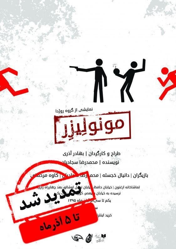 نمایش مونولیزر که از اوایل آبان ماه در تماشاخانه ارغنون روی صحنه رفته تا روز جمعه ٥ آذر تمدید شد.