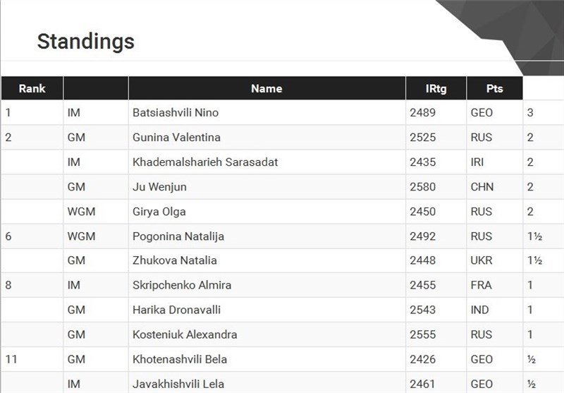 بانوی شطرنج‌باز کشورمان با این پیروزی 2 امتیازی شد و موفق شد به رده دوم جدول صعود کند. این در حالی است که گونینا از روسیه، ون جون جو از چین و اولگا گیریا از روسیه نیز 2 امتیازی هستند و با صورت مشترک رتبه دوم را در کنار خادم‌الشریعه در اختیار دارند.