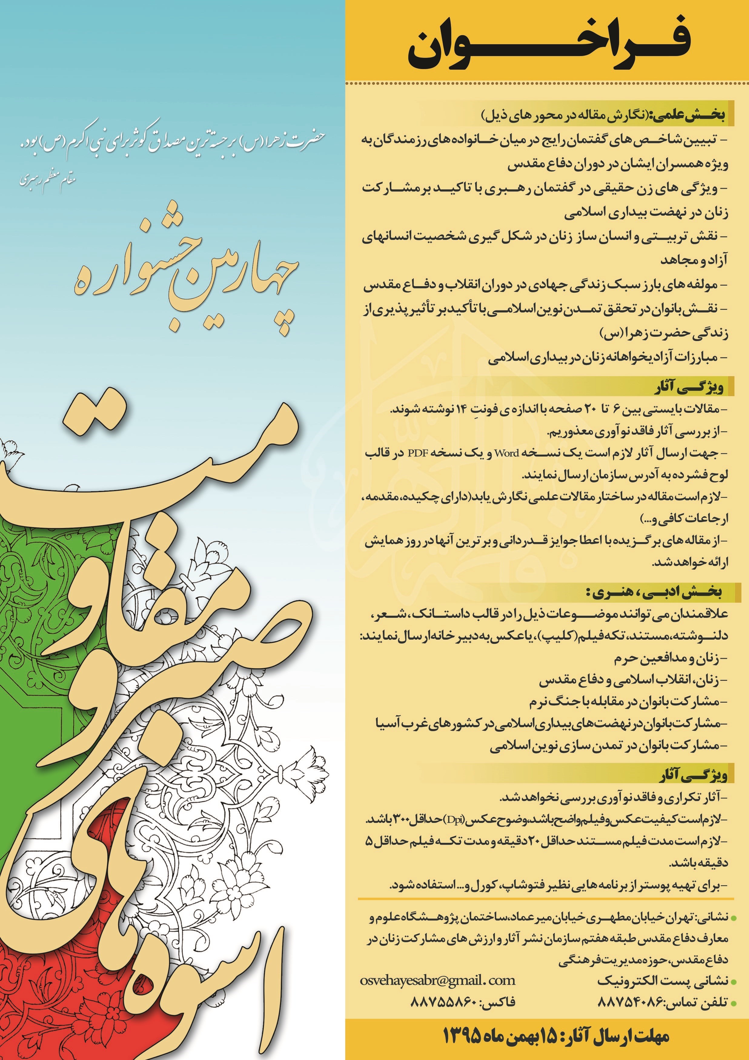 مهلت ارسال آثار این فراخوان هم تا 15 بهمن ماه سال 95 است.