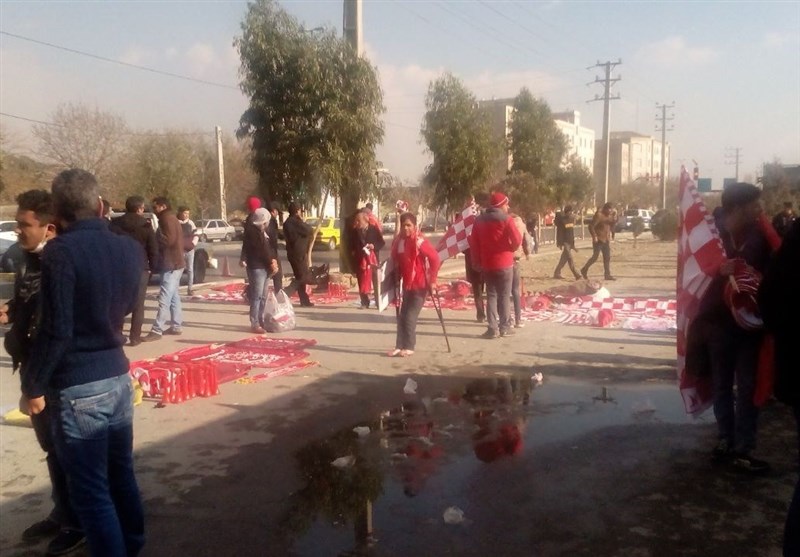 * لیدرهای طرفدار پیکان زیر جایگاه خبرنگاران مستقر هستند و با سر و صدای زیاد خود آرامش را از خبرنگاران گرفتهاند. همچنین افراد متفرقهای هم در جایگاه خبرنگاران حضور دارند.