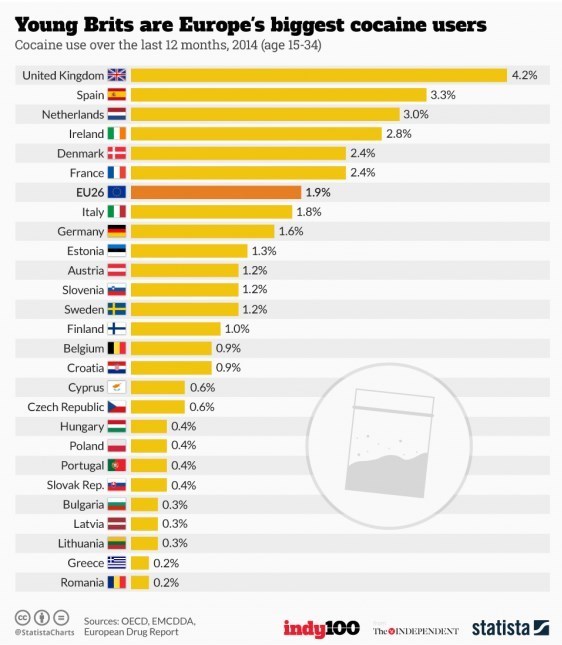 نمودار زیر نشان می‌دهد که جوانان انگلیسی در زمینه مصرف ماده مخدر کوکائین در صدر کشورهای اروپایی قرار دارد.