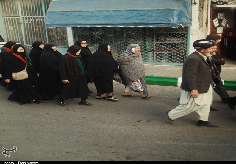 روحانی کاروان جلو جلو میرود و با صدای بلند میگوید که «هدیه به روح همه اموات و درگذشتگان صلوات»، «اللهم صل علی محمد و آل محمد»...با صدای یکصدای صلوات توجه همه به زائران افغانستانی جلب میشود و همه با نگاههای پرسشگر و اغلب تخسین برانگیز خود زائران را دنبال میکنند، در چینشی منظم روحانی کاروان که راه بلد جمع است پیش از دیگران میرود، مردان پشت سرش و زنان کمی عقبتر.
