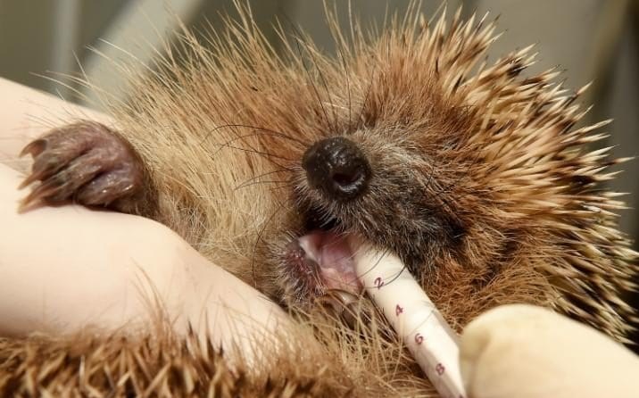 برای شیردادن به این خارپشت که طولش 4 سانتی‌متر است از پستانک مخصوص  استفاده می‌شود.