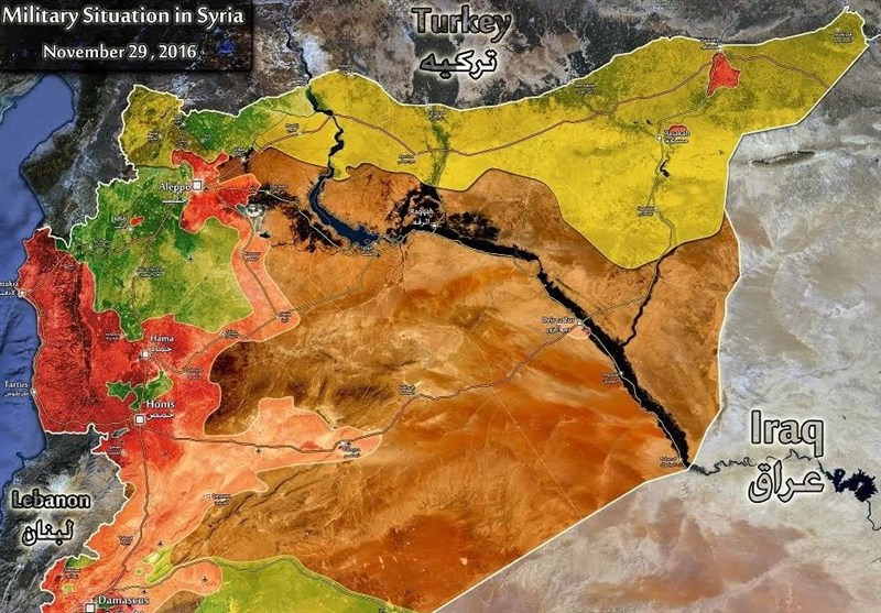 رنگ قرمز: مناطق تحت کنترل ارتش سوریه، رنگ سیاه: مناطق تحت اشغال تروریست‌های داعشی، رنگ زرد مناطق تحت سیطره کردها و رنگ سبز مناطق تحت کنترل جبهه‌ تروریستی النصره و دیگر گروه‌ها