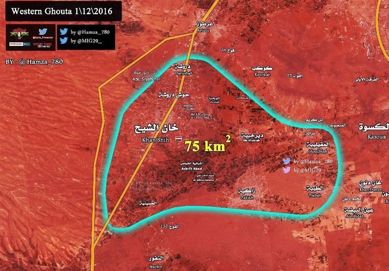 شرق حومه دمشق : بخش‌های وسیعی از غوطه شرقی در کنترل ارتش سوریه است، ارتش توانست با پیشروی به عمق غوطه بیش از 50 درصد آن را از اشغال تکفیری‌ها آزاد کند و همچنان به تنگ‌ کردن عرصه بر تروریست‌های باقی مانده در این مناطق ادامه می‌دهد و به  نزدیکی مهمترین دژ تروریست‌ها یعنی شهر دوما رسیده است به طوری که تنها دو کیلومتر از مرکز شهر فاصله دارد.