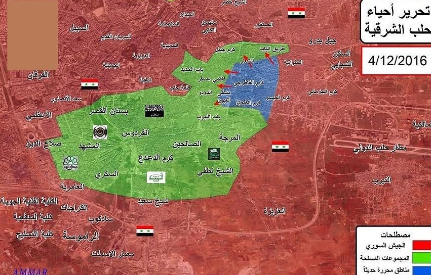 حالتی از آشفتگی و سرخوردگی بر گروه‌های تروریستی در محله‌هایی که همچنان در اشغال آنهاست، حاکم شده است، آنها در محاصره کامل ارتش قرار دارند، محله‌هایی همچون السکری، الصالحین، صلاح‌الدین، المشهد و بستان القصر و بخش‌هایی از محله‌ قدیمی در مرکز حلب همچنان در اشغال این گروه‌هاست و ارتش سوریه به عملیات سریع و گسترده خود برای بیرون راندن آنها از این مناطق ادامه می‌ دهد.