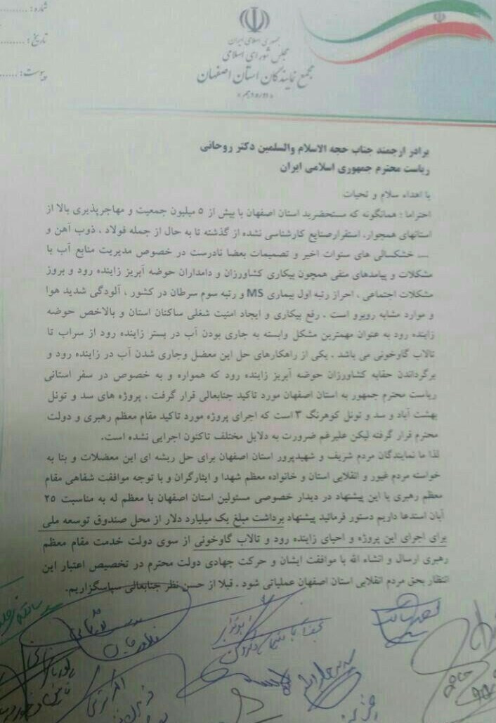 «لذا ما نمایندگان مردم شریف و شهید پرور استان اصفهان برای حل ریشهای این معضلات و بنا به خواسته مردم غیور و انقلابی استان و خانواده معظم شهدا و ایثارگران و با توجه موافقت شفاهی مقام معظم رهبری با این پیشنهاد در دیدار خصوصی مسئولان استان اصفهان با معظم له به مناسبت 25 آبان استدعا داریم دستور فرمایید پیشنهاد برداشت مبلغ یک میلیارد دلار از محل صندوق توسعه ملی برای اجرای این پروژه و احیای زاینده رود و تالاب گاوخونی از سوی دولت خدمت مقام معظم رهبری ارسال و انشالله با موافقت ایشان و حرکت جهادی دولت محترم در تخصیص اعتبار این انتظار به حق مردم انقلابی استان اصفهان عملیاتی شود.»