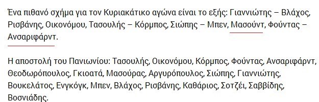 سایت ورزش یونان ترکیب اصلی تیم پانیونیوس در بازی هفته یازدهم سوپر لیگ فوتبال این کشور را منتشر کرد که نام کریم انصاری فرد و مسعود شجاعی نیز در آن دیده می شود. تیم پانیونیوس هم اکنون با 15 امتیاز جایگاه هفتم جدول رده بندی سوپر لیگ یونان را در اختیار دارد.