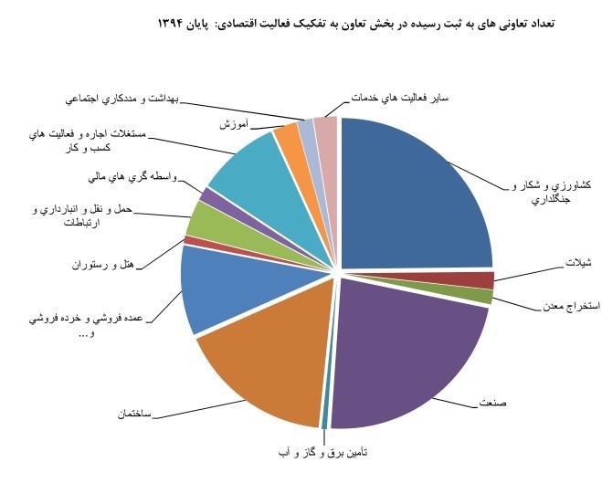 بر اساس نتایج منتشر شده 27 درصد تعاونی ها در رده کشاورزی و شیلات و 23 درصد در رده صنعت، 2درصد در رده معدن، 17 درصد در رده ساختمان،4 درصد در رشته حمل و نقل و انبارداری، 2 درصد در رده واسطه گری های مالی، 10درصد در رده عمده فروشی و خرده فروشی و 15 درصد در سایر رده ها قرار می گیرند.