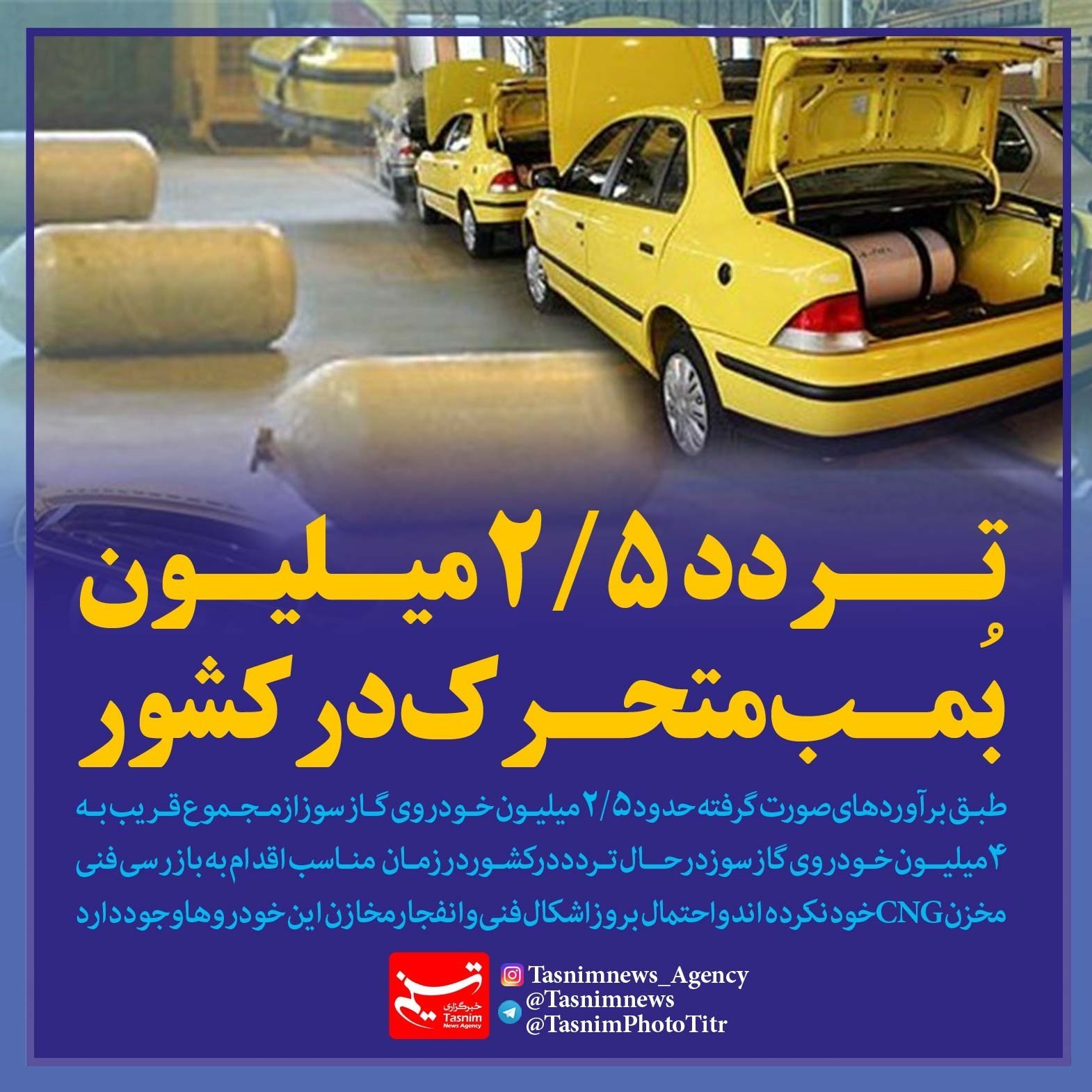 طبق برآوردهای صورت گرفته حدود 2 میلیون و 500 هزار خودروی گازسوز از مجموع قریب به 4 میلیون خودروی گازسوز در حال تردد در کشور، در زمان مناسب اقدام به بازرسی فنی مخزن CNG خود نکرده اند و احتمال بروز اشکال فنی و انفجار مخازن این خودروها وجود دارد.