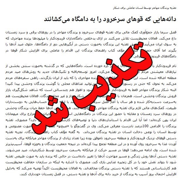 هجمه ها علیه غذارسانی جمعیت کوچکی از علاقه مندان محیط زیست به پرندگان مهاجر در شمال کشور، آنقدر شدید بودند که بسیاری از خوانندگان را متقاعد کردند که غذارسانی به پرندگان مهاجر نه تنها عامل شیوع آنفلوانزای فوق حاد پرندگان در کشور است بلکه سبب کشاندن این میهمانان خسته بال به دامگاه های صیادان است و دچار کردن الباقی آنها به چاقی مفرط و کمبود پروتئین! اما با تکذیب ادعاهای بی اساس فوق، این شبهه به جا می ماند که این شایعات با چه انگیزه ای در فضای مجازی منتشر شده اند تا انگشت اتهام جامعه را از صیادانی که عامل اصلی کشتار و قاچاق پرندگان مهاجر بوده و همچنین با فروش گوشت آنها در شیوع آنفلوانزای فوق حاد پرندگان نقشی به سزا ایفا می کنند، به سوی معدود علاقه مندان حیات وحشی منحرف کنند که با تهیه خوراکی مختصر تلاش می کنند قوهای مهاجر را در نقاط امن نگاه داشته و از نزدیک شدن به آب بندان ها در جستجوی خوراک باز دارند؟ آب بندان هایی که در گوشه و کنارشان صیادان برای پذیرایی از پرندگان خسته و گرسنه کمین کرده اند. نه اینکه غذارسانی به پرندگان مهاجر، کسب و کار صیادان قوها وحشی را دستکم تا حدودی از رونق می اندازد؟