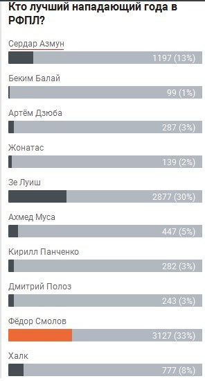 در پایان روز اول این نظرسنجی فدور اسمولوف، مهاجم تیم کراسنودار با کسب 33 درصد آرای مردمی جایگاه نخست را در اختیار دارد. ژوژه لوئیس، مهاجم فوگویی تیم اسپارتاک مسکو با دریافت 30 درصد آراء رتبه دوم را به خود اختصاص داده و سردار آزمون از تیم روستوف نیز توانسته با آرای 13 درصدی در رده سوم قرار بگیرد.