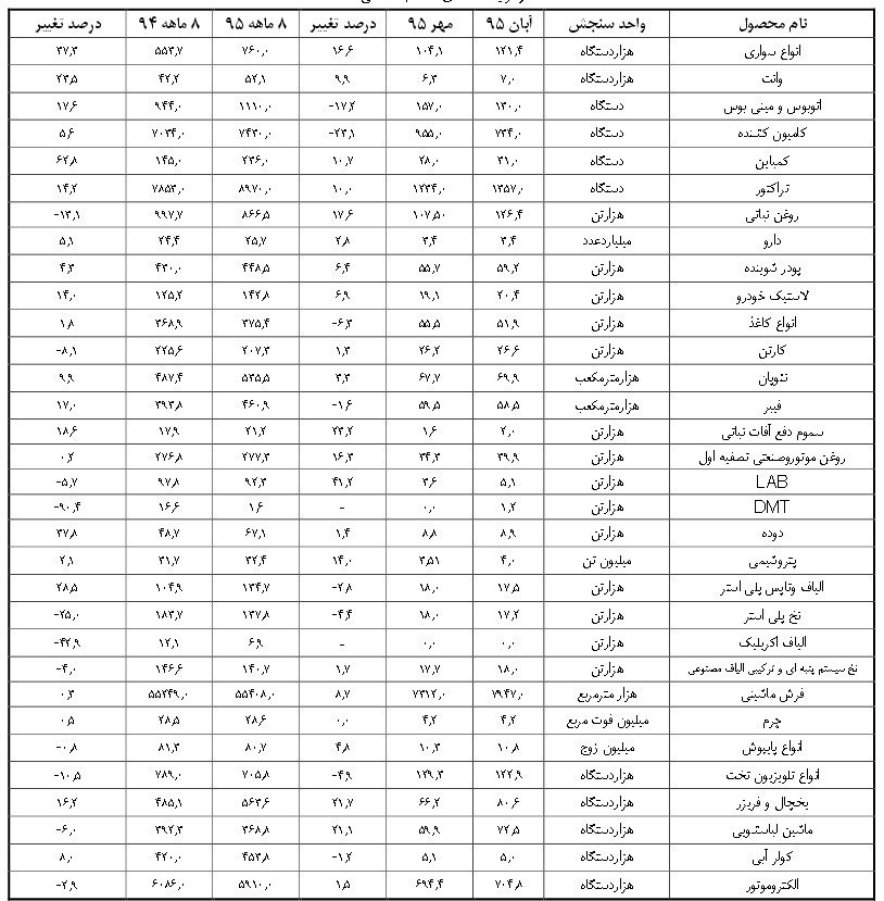 براساس آمار تولید انواع خودروی سواری 37.3 درصد و کمباین با رشد 62.8 درصدی روبه رو بوده است. در کنار این تولید روغن نباتی 13.1 درصد، کارتن 8.1 درصد، نخ پلی استر 25 درصد، انواع تلویزیون تخت 10.5 درصد و ماشین لباسشویی 7 درصد کاهش حجم تولید را نسبت به مدت مشابهه در سال گذشته تجربه کرده اند.