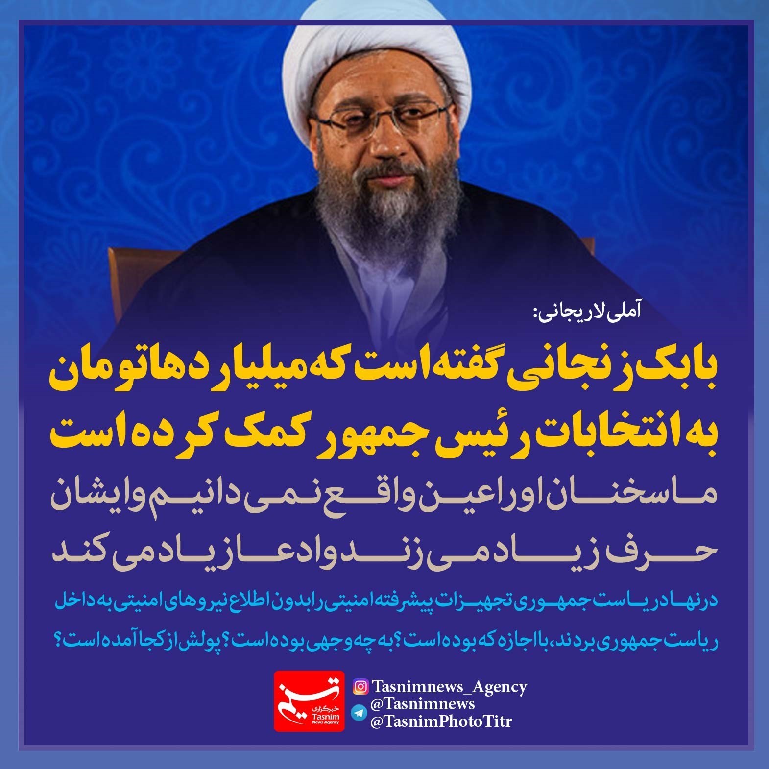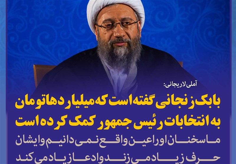 آملی‌لاریجانی گفت: بابک زنجانی گفته میلیاردها تومان به انتخابات رئیس جمهور کمک کرده است؛ سخنان او را عین واقع نمی دانیم و ایشان حرف زیاد می‌زند و ادعا زیاد می‌کند والا اگر می‌خواستیم رسیدگی کنیم باید همه کسانیکه مرتبط بودند احضار می‌کردیم.