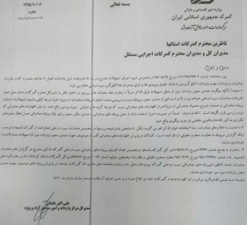 صادرات صوری سیب درختی و سیب‌های بی کیفیت در برخی گمرکات موجب شد، گمرک در بخشنامه ای دستورالعمل واردات موز با تعرفه 5 درصد در قبال صادرات سیب درختی را تا اطلاع ثانوی در 3 گمرک متوقف کند.