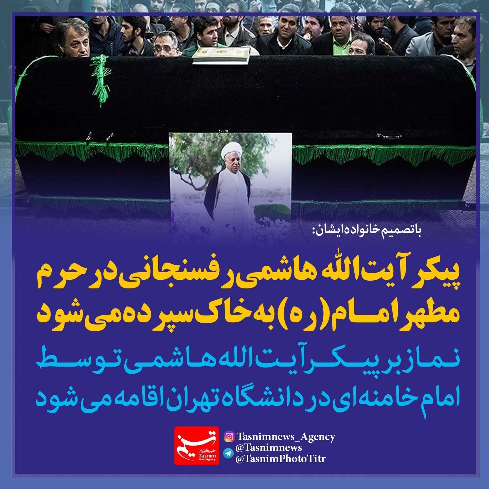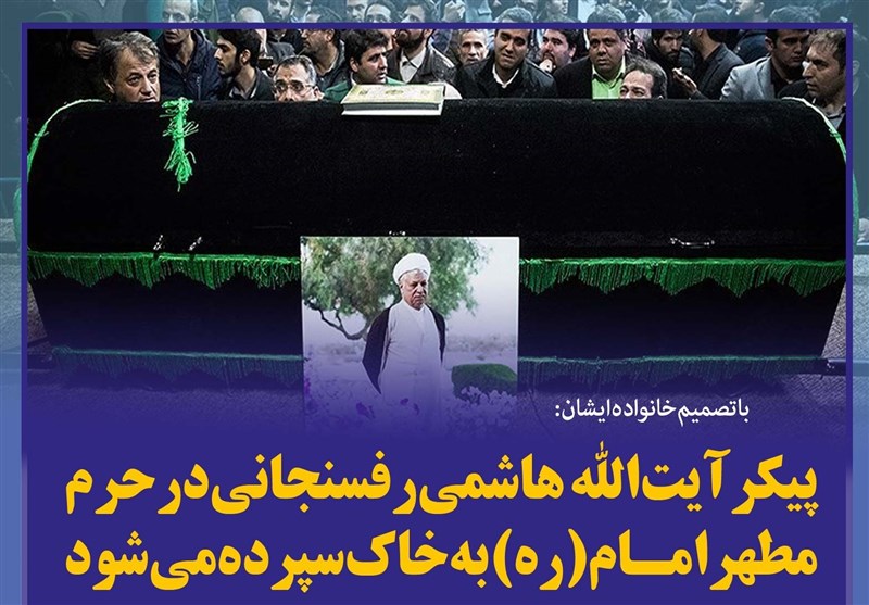 با تصمیم خانواده مرحوم آیت‌الله هاشمی‌رفسنجانی، پیکر وی در حرم مطهر امام‌خمینی(ره) به خاک سپرده می‌شود.