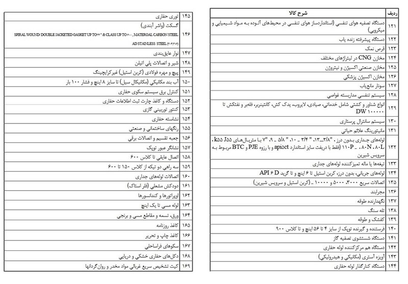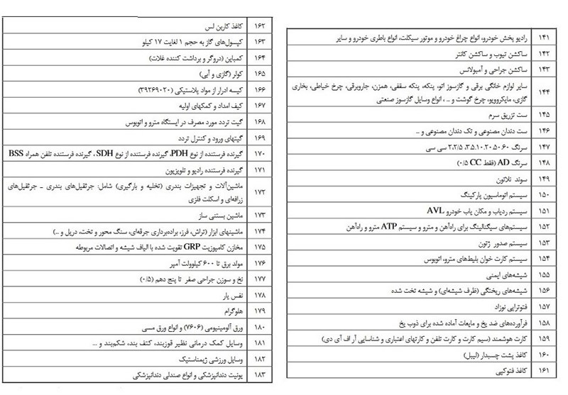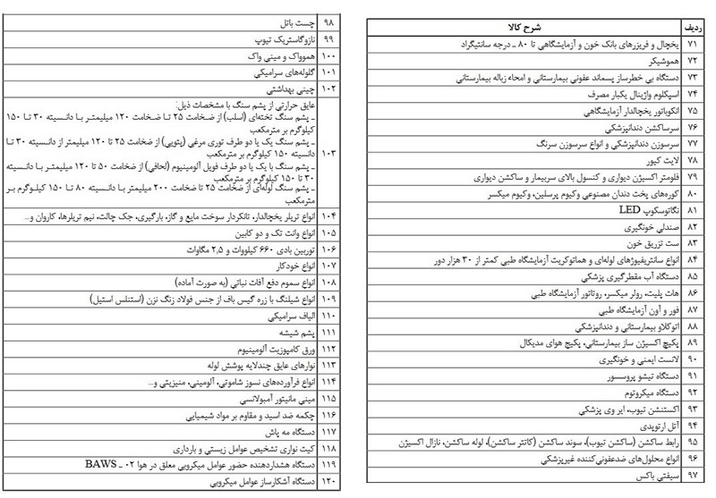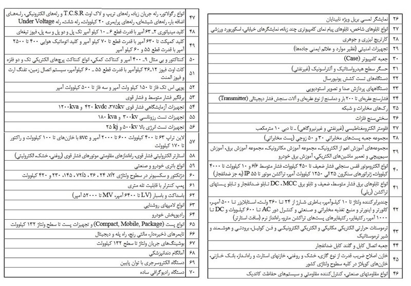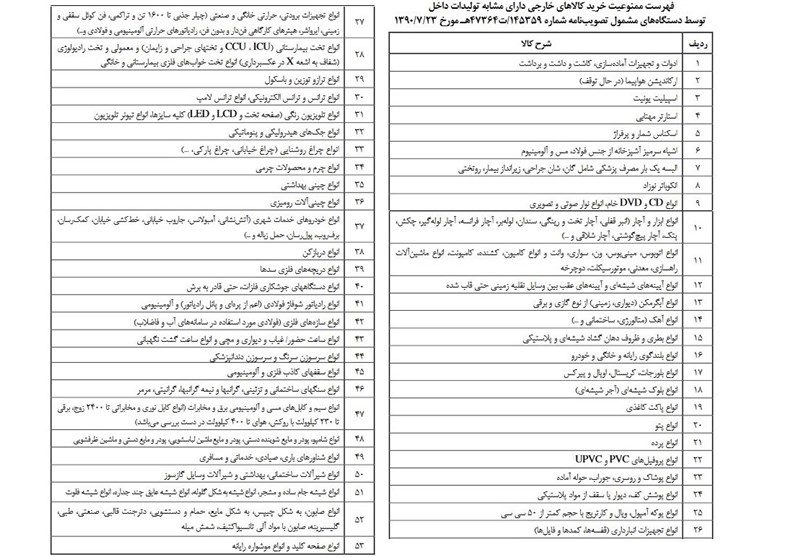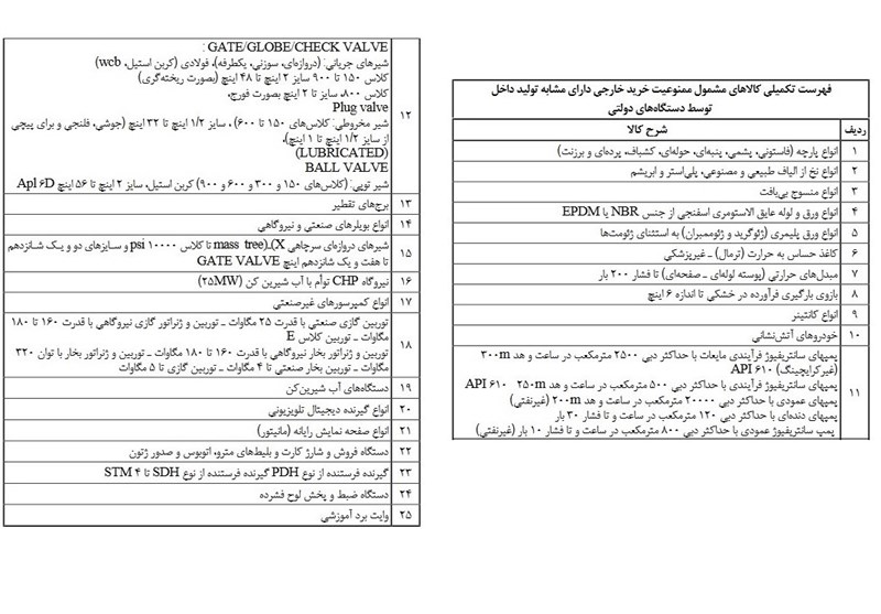 • خرید کالاهای خارجی (اعم از کالای ساخته شده، قطعات، ملزومات، تجهیزات و غیره تحت هر عنوان) دارای تولید مشابه داخلی، مندرج در فهرست پیوست که تأیید شده به مهر دفتر هیئت دولت است، توسط تمامی دستگاههای دولتی (موضوع مواد (2)، (3)، (4) و (5) قانون محاسبات عمومی کشور ـ مصوب 1366ـ و ماده (5) قانون مدیریت خدمات کشوری، مصوب 1386ـ و موارد مستثنی در ماده (117) قانون مدیریت خدمات کشوری) و سایر دستگاهها، نهادها و عناوین مشابهی که به نحوی از بودجه عمومی یا دولتی استفاده میکنند، در صورت انجام هزینه از محل وجوه دریافتی از بودجه عمومی یا دولتی بابت خرید این نوع کالاها به صورت مستقیم یا از طریق پیمانکاران تملک داراییهای سرمایهای، ممنوع بوده و ذیحسابان دستگاههای اجرایی یا عناوین مشابه مکلفند از پرداخت اعتبار خرید کالاهای یاد شده به صورت مستقیم یا اسناد مندرج در صورت وضعیتهای ارسالی از سوی پیمانکاران خودداری نمایند.