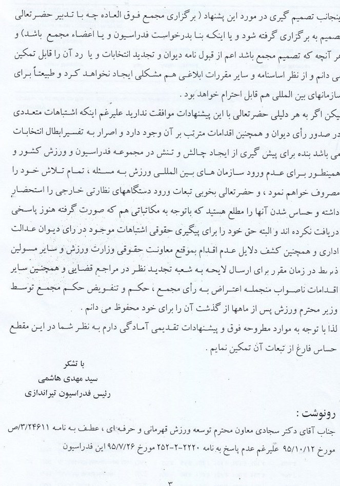 حال که بنا به تصمیم وزیر محترم ورزش و جوانان برای برونرفت از فشارهای نابخردانه وناصواب که شائبه سیاسی آن بیش از 3 سال است بسیاری را خسته کرده و از آنجا که این تضادها بیش از پیش مانع کسب توفیقات افزونتر و موجب تشدید کندی در مسیر روند روبهرشد ورزش ارزشی تیراندازی گشته است و همچنین اخذ این تصمیم غیرقانونی و عرفی که حتی اینجانب نیز از طریق رسانهها از آن مطلع شدهام، لازم میدانم ضمن معطوف نمودن اذهان به نامه شماره 3128-1-252 مورخه 95.10.18 و به جهت حفظ روند توسعه این مسیر و شرایط حساس ورزش تیراندازی، توجه دستاندرکاران محترم به این تصمیم نامناسب و کجاندیشی غیرقابل توصیف در حوزه ورزشی کشور جلب نمایم.