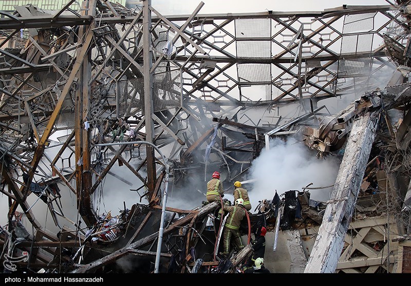 فیلم/تلاش برای برداشتن راس سازه پلاسکو و افزایش دود در محل