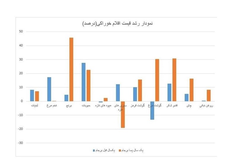 در ادامه نمودار رشد قیمت 11 گروه مواد غذایی قبل و پس از برجام را ببینید.