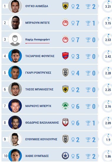 براون ایدیه، مهاجم نیجریهای و هم پستی کریم انصاریفرد در تیم المپیاکوس رتبه دوم ردهبندی را با کسب امتیاز 3.15 به خود اختصاص داده است. انصاریفرد نیز با امتیاز 2.53 رتبه سوم را در اختیار دارد. این مهاجم ایرانی 7 بار در طول 17 هفته فصل جاری سوپر لیگ یونان نامزد دریافت جوایز بهترین بازیکن و زننده زیباترین گل هفته شده بود.