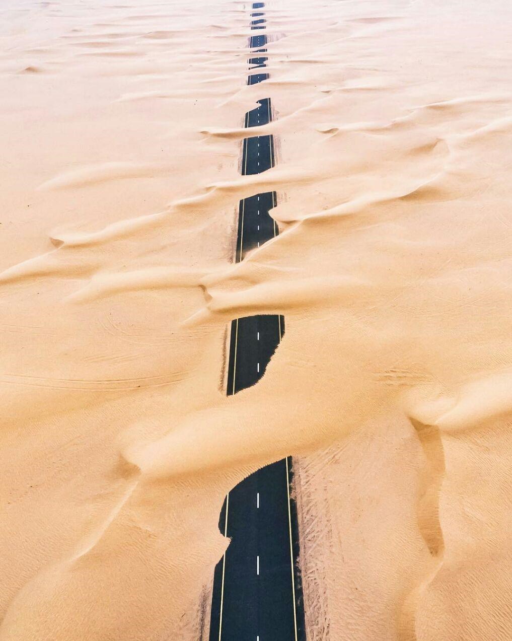 ماسه‌های سرگردان در جاده‌ها، دبی، امارات متحده نمایش داده می‌شود.