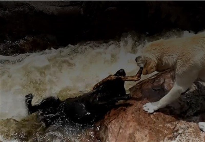 سگ شجاع برای نجات دادن دوستش یک تکه چوب بزرگ را به دهان گرفت و و با آن دوستش را از داخل آب بیرون کشید.