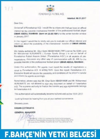 به گزارش خبرگزاری تسنیم، عمر عبدالرحمن، بازیکن سال 2016 فوتبال آسیا و باشگاه العین امارات پیشنهاد قابل توجهی را از تیم مطرح فنرباغچه ترکیه پس از تیم انگلیسی منچسترسیتی دریافت کرده است. هر چند باشگاه انگلیسی به خاطر مشکلات در دریافت ویزای کار عبدالرحمن از ادامه مذاکره منصرف شد اما فنرباغچه ترکیه 7 ژانویه سال جاری میلادی (18 دی ماه) پیشنهاد رسمی خود را به العین ارسال کرد.