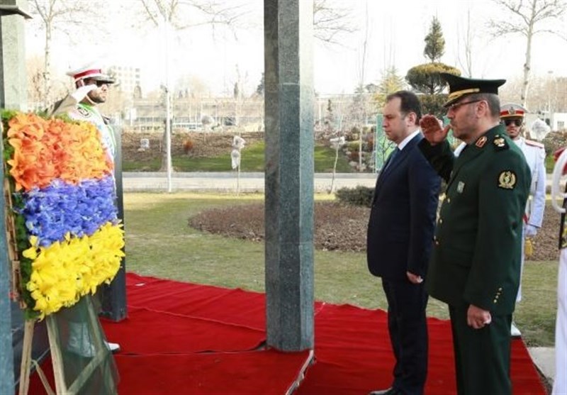 وزیر دفاع جمهوری ارمنستان پس از ادای احترام به مقام شامخ شهیدان به طور رسمی مورد استقبال سردار حسین دهقان وزیر دفاع جمهوری اسلامی ایران قرار گرفت.