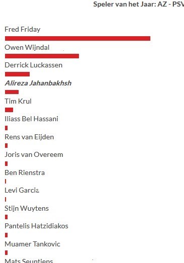 در این میان سایت رسمی هواداران تیم آلکمار طبق روال معمول دیدارهای رسمی اقدام به برگزاری نظرسنجی برترینهای این تیم در دیدار هفته بیستویکم اردویژه هلند برابر آیندهوون کرد که فرد فرایدی، مهاجم نیجریهای و زننده دو گل تیم آلکمار جایگاه نخست را به دست آورد. اوون ویندال و دریک لوکاسن در ردههای دوم و سوم قرار گرفتند. علیرضا جهانبخش نیز رتبه چهارمی را کسب کرد.