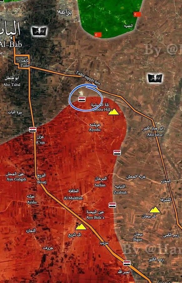 به گزارش خبرنگار خبرگزاری تسنیم در دمشق، نیروهای ارتش سوریه دقایقی پیش، تپههای «الحواره و المجبل» در شمال غربی تپه «العویشنه» در حومه شرقی حلب را آزاد کردند تا حلقه محاصره گروه تروریستی داعش در شهر «الباب» بیش از پیش تنگتر شود.