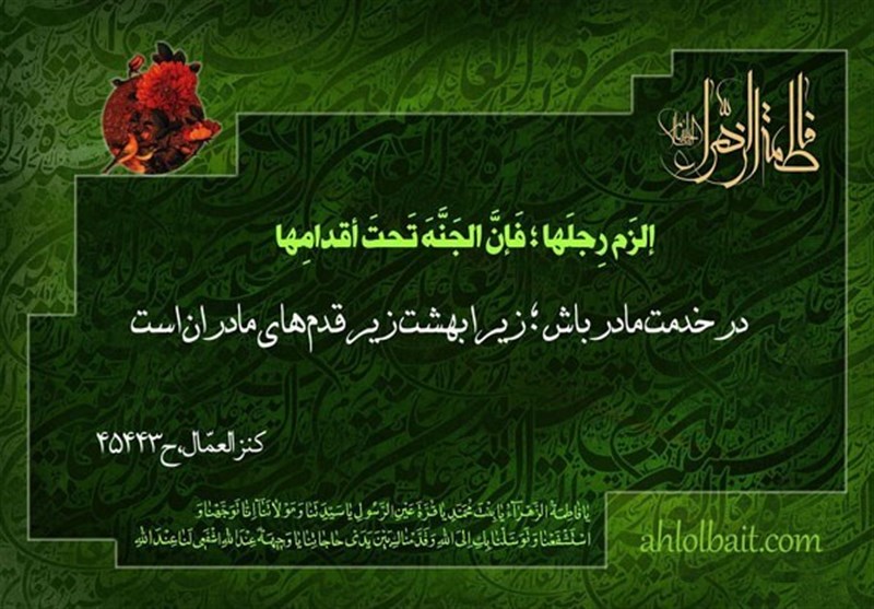حضرت زهرا (س) در حدیثی دربارۀ اهمیت جایگاه مادر میفرمایند: «الْزَمْ رِجْلَها، فَإنَّ الْجَنَّةَ تَحْتَ أقْدامِها»، همیشه در خدمت مادر و پای بند او باش، چراکه بهشت زیر پای مادران است. (کنزالعمال، ج 16، ص 462، ح 45443)